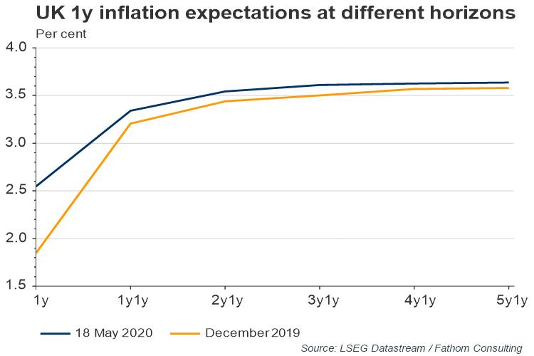 The charts below show, separately for the US and UK, the one-year inflation rate at different horizons as implied by swap markets at the beginning of the year and as of two days ago. While investors believe the impact of COVID to be clearly deflationary, it seems to be much more temporary and smaller in nature in the UK than in the US.