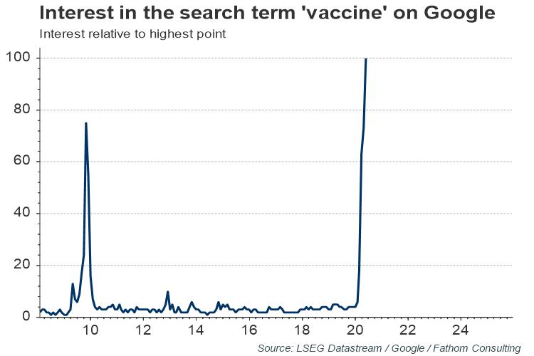 The most expectation-shifting development of the week so far has been the announcement that biotech company Moderna has been fast-tracked for stage 2 vaccine trials. According to Google trends, interest in the word ‘vaccine’ among news articles is likely to surpass that recorded during the swine flu outbreak in 2009.