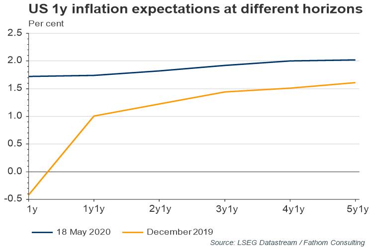 Inflation markets are another corner of the investment world with interesting dispersion in expectations. In spite of actual inflation having come down decisively across both sides of the Atlantic (today UK CPI fell 0.2% MoM and only rose 0.8% YoY in April), COVID (and oil-related) disruptions appear to be affecting US inflation expectations much more permanently than those of the UK.