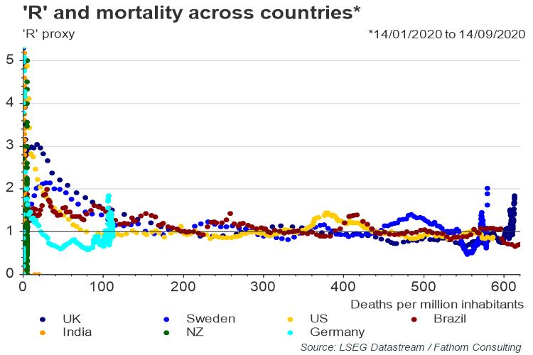 In previous research we found that the rate of spread of the disease in countries affected by the virus had tended on average to fall over time, for reasons unrelated to periods of lockdown. That statistical result still holds true today. As the number of people exposed to the virus in a particular location rises, we are likely to see a sustained fall in its reproductive rate, or ‘R’, both because of heterogeneity across individuals, and because the proportion of the population which remains susceptible will have fallen. But some of the fall in ‘R’ that has tended to follow severe outbreaks of the disease will have been cyclical, reflecting temporary changes in behaviour, such as more frequent handwashing and voluntary social distancing. As the chart below shows, the reproductive rate of the virus has tended to fluctuate around 1 in countries that have already suffered severe outbreaks. It might rise briefly above 1, as people begin to relax, only to fall back below 1 as people again change their behaviours in response to news that cases are on the rise. It is our hope, and our expectation, that the rate at which the virus is spreading through those countries in Europe that were worst affected in the spring will fall back in the coming weeks as people adjust their behaviours; and that this will occur without a significant increase in mortality, and without the need for further national lockdowns on the scale of those seen through spring and into the summer.
