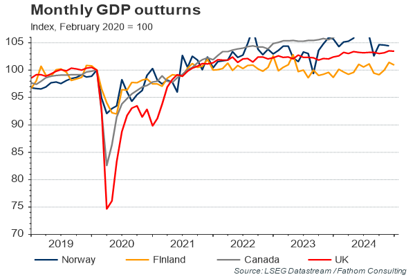 In our Global Economic and Markets Outlook for 2020 Q4, a preview of which was sent to clients earlier this week, we present a central scenario where the global economic recovery continues uninterrupted. We use high-frequency smartphone data to conclude that, on a cautious assessment, around one-half of the fall in global economic activity through the first half of this year was recovered during the third quarter. Very few major economies publish monthly estimates of GDP, but where these data are available, they point to a V-shaped recovery. Canada had made up around one-half of its lost output by June, while both Norway and the UK had done so by July.