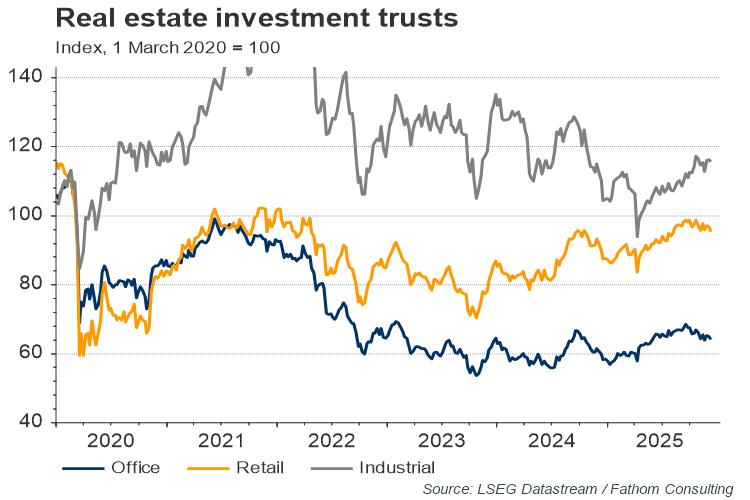 Social distancing measures put in place during the pandemic have led to profound changes in the way many of us live our lives. Some of these will be reversed in time, but others will endure. In a recent blog post, Joanna Davies highlighted the fact that only around one-third of UK office workers had returned to their usual place of work, substantially below the European average, which was closer to two-thirds. We have started to discuss with our clients the consequences that these changes will have for asset values, and for real estate in particular —both residential (where the impact will vary by region), and commercial (where the impact will vary by type). To date, industrial REITs have substantially outperformed both retail and office REITS, which makes sense to us. However, we do continue to question the relative pricing of retail and office space. Changes in the working practices of white-collar workers are making themselves felt not just in property values, but in consumer prices, as our final chart illustrates.