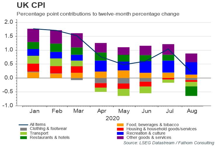 The decline in UK headline inflation in August was largely due to the introduction of the government’s Eat Out To Help Out scheme. Since CPI is designed to reflect the prices paid by consumers, and the scheme is effectively a subsidy on private consumption, the ONS reported a substantial fall in the cost of dining out in August. Despite a relatively small weighting in the overall consumption basket (12%), heavily discounted meals knocked around 0.3 percentage points off the headline inflation rate having contributed 0.2 percentage points in July, a total swing of more than 0.5 percentage points.