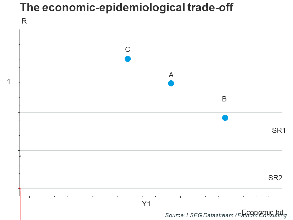This conceptual relationship might be summarised in a chart such as the one below. In the short run, the range of outcomes available to a government might be summarised in curve SR1 below. If a government targeted an R number of close to but below 1 (as many did during the first wave), the economic hit is given by Y1. Alternatively, policymakers could target better health outcomes (and worse economic outcomes) by opting for policy B or target a herd-immunity approach and end up closer to point C.