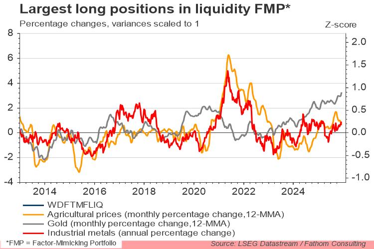 The chart below shows the three assets with the largest positive weights in our liquidity factor-mimicking portfolio: gold, agricultural prices and industrial metals. Each has a large positive weight in our factor-mimicking portfolio, which can be interpreted as taking a long position on those three assets.
