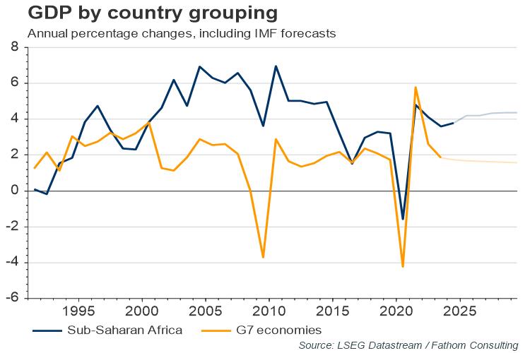 Economic growth in sub-Saharan Africa fell below zero for the first time in more than a quarter of a century in 2020. Official COVID-19 case and mortality figures have been relatively low in Africa. However, even with less severe health outcomes and looser restrictions on economic activity, many countries on the continent have suffered from weak international demand and its consequent impact on commodities prices, while tourist-reliant economies have also fared poorly. Meanwhile, reduced fiscal space has meant that governments have been unable to support households and businesses as much as in the advanced economies. As a result, there is likely to be less of a boost from excess savings this year. That fact seems especially true as vaccine rollouts across most of the continent continue to lag that in rich countries, meaning health risks will probably linger for longer. As a result, forecast GDP growth for 2021 shows sub-Saharan Africa lagging the G7 group of industrialised nations for only the second time since the turn of the millennium. What has become a customary growth gap is expected to return in the medium term as the effects from the pandemic wane.