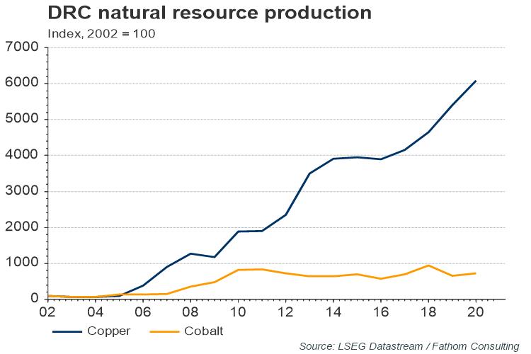 It is well endowed with natural resources such as cobalt (commonly referred to as the blood diamond of batteries), coltan (a key ingredient for the electronics industry) and copper (used for wiring in electrical equipment and motors), with its export share of natural resources and energy almost four times that of the world. In other words, it is highly specialised, as confirmed by data from Fathom’s proprietary RiCArdo database. This database contains detailed export data for over 200 countries and regions, with that data categorised into sectors of interest, such as those shown in the chart below.