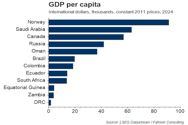 True to the resource curse thesis, despite being resource rich, and with the extraction of those resources having risen sharply over the last 20 years, the DRC remains one of the poorest countries in the world. Its GDP per capita lags behind that of other resource-rich economies, such as Norway and Chile, which have successfully avoided the resource curse, but is not dissimilar to the likes of Equatorial Guinea and Zambia.