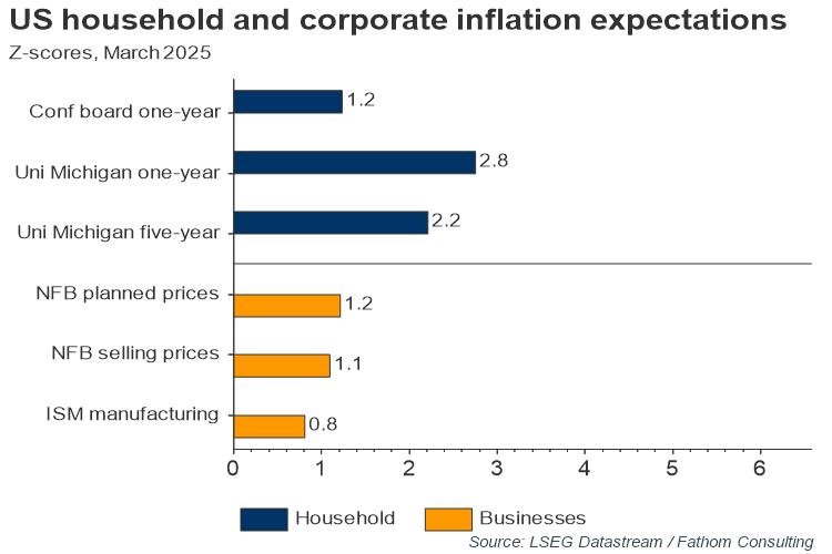 In our first scenario, which we have named ‘Steady as she goes’, households remain cautious, fearing further disease outbreaks, and pandemic savings go largely unspent. Here, the rise in inflation proves transitory and inflation returns to target sharply. In ‘Goldilocks’, our second scenario, 25% of pandemic savings are spent this year, pushing inflation higher. Survey data collected and published by the Bank of England, the New York Fed and the US Census Bureau are consistent with households either having spent, or intending to spend, around a quarter of their pandemic savings. However, inflation expectations remain firmly anchored, such that inflation returns to target within a year or two. Collectively, Fathom places a 40% weight on these two scenarios, where monetary policymakers have very little to do.