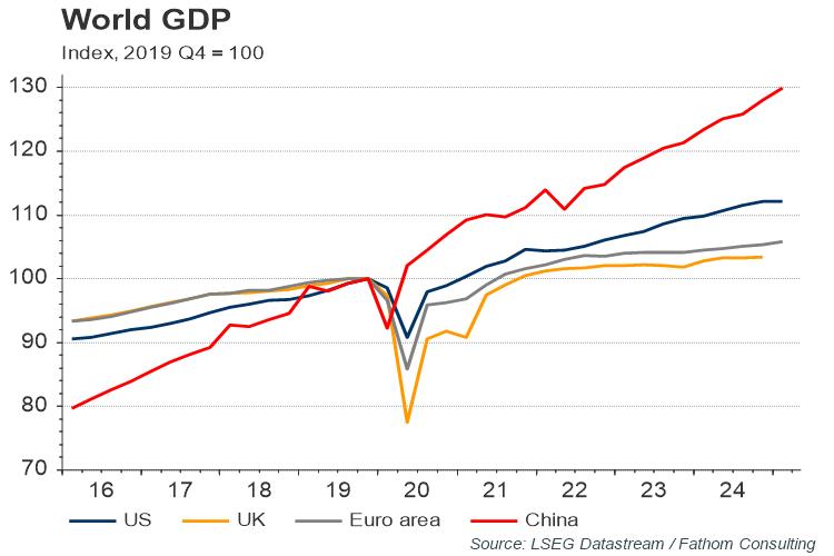 Last year’s collapse in global economic activity differed in pace and scale from any previous recession. Equally the recovery, now well established in most economies, will be unlike anything we have seen before. The global V-shaped recovery is complete, with global GDP above the pre-pandemic level in 2021 Q1. This has predominantly been driven by China, though the US is within a whisker of its 2019 Q4 level. Where we go from here will partly depend on how rapidly households in the major economies spend their excess savings pots, which are estimated to be worth 8%-9% of GDP in the US and the UK, and a little bit less in the euro area. Here we outline four broad scenarios considered in Fathom’s Global Economic and Markets Outlook for 2021 Q3, and what each of them means for the inflation outlook.