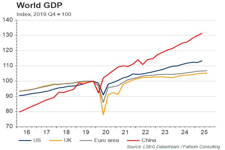 Overall, as expected the global ‘V’ shaped recovery is complete. But what will happen next as economies continue to reopen? Fathom expects that — unless there is a resurgence in the virus — economic growth will surge over the rest of this year as the money built up in savings is spent by households. This would drive inflation above central bank targets, and would pose central bankers the dilemma of how best to respond. The orthodox approach would see monetary policy tightened in the short term to bring inflation back under control. Alternately, higher inflation might be accommodated, even welcomed; and then embedded, by setting a higher inflation target down the line. As Fathom has long noted, there are strong theoretical grounds for adopting the second approach.[1] We consider this to be the most likely scenario in our latest Global Economic and Markets Outlook.[2]