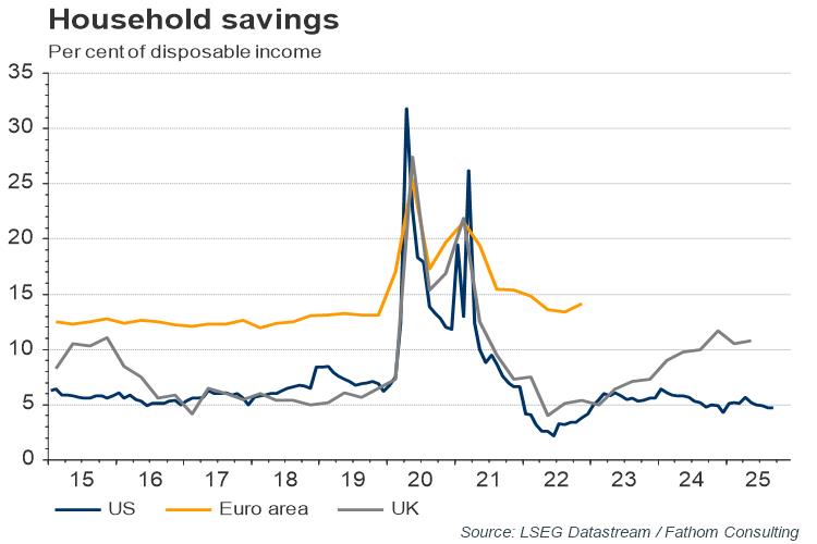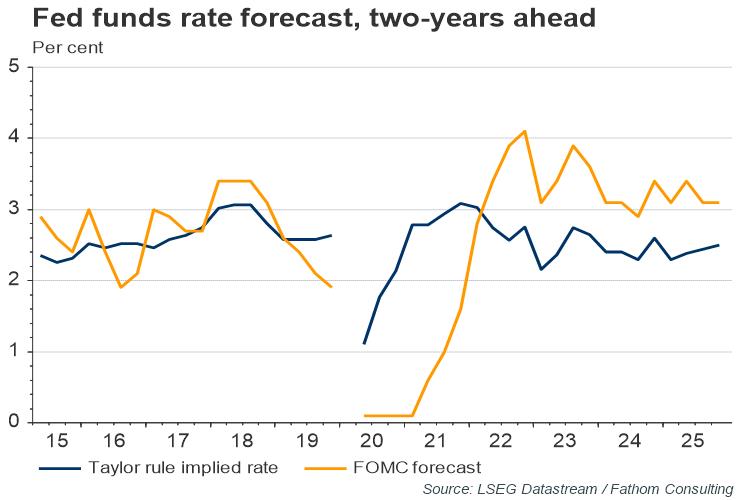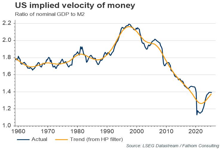 So, what does this approach say about the inflation outlook? Historically, deviations in the velocity of money from trend typically narrow by about 10% per quarter. If the ‘velocity gap’ closes at that rate, money supply grows at 5% per annum, and real GDP grows in line with Fathom’s central forecast, then the identity outlined above suggests that US inflation could reach double digits.