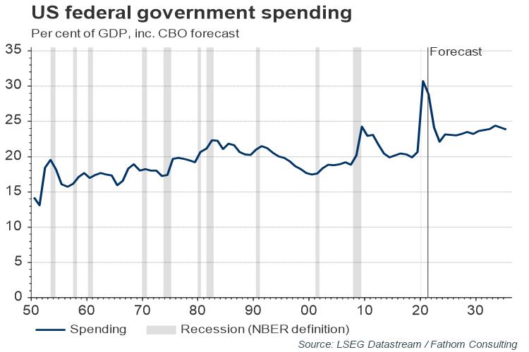 Weaker US growth since the Global Financial Crisis (GFC) has left a $22 trillion shortfall in US GDP relative to its pre-GFC trend. The Biden administration views the $1.8 trillion stimulus package put in place at the time as too timid, and partly to blame for the resultant economic scarring. This administration has set out a much bolder fiscal stimulus package that aims to almost exactly match the shortfall in GDP caused by the COVID-19 pandemic, with an aim of reaching and potentially surpassing the pre-crisis trend. The $5.5 trillion stimulus package errs on the side of doing too much rather than too little. As a result, we have seen, and Fathom continues to expect, a much faster recovery compared to the GFC. This goes hand in hand with the risk of higher inflation.