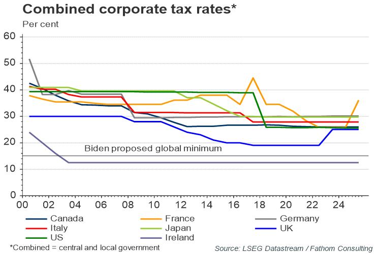 While government revenues are expected to increase, bigger spending is not quite matched by bigger taxes, suggesting that the US is not adopting a Swedish-style system of high spending and high taxes. Nonetheless, domestic corporates are in the firing line of tax rises, with the Biden administration proposing a corporate income tax rate of 28%, up from the current 21% in place since 2018. And international firms are also being targeted, with a US-led proposal for a global minimum corporate tax rate of 15% now agreed by over 100 countries. The OECD estimates suggests such a policy would benefit high-income countries most.