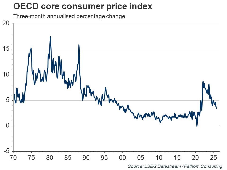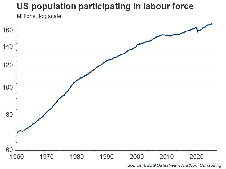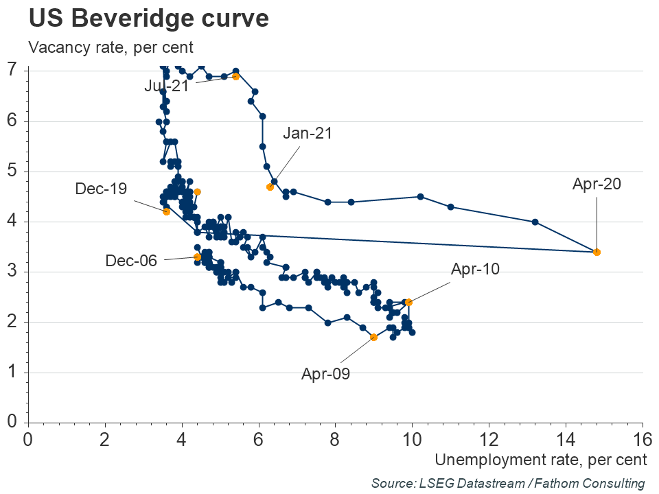 The risk of persistently higher inflation arises in part from the labour market. Since the pandemic, the US has experienced a higher level of unemployment for any given level of vacancies: the Beveridge curve has shifted out to the right. That shift reflects an increase in labour mark ‘rigidities’, probably, in this case, deriving from a mismatch between the type or location of vacancies that have arisen and the labour force available to fill those opportunities: a laid-off barista in a coffee shop in Detroit cannot readily take up a position as a software engineer in San Francisco, for example. The greater the labour market mismatch, the higher is the structural rate of unemployment, and the greater the potential impact on inflation arising from running the economy hot. It remains to be seen, of course, whether the Beveridge curve will shift back to the left, which is what Fathom assumes in central case — a great deal hinges on that question.