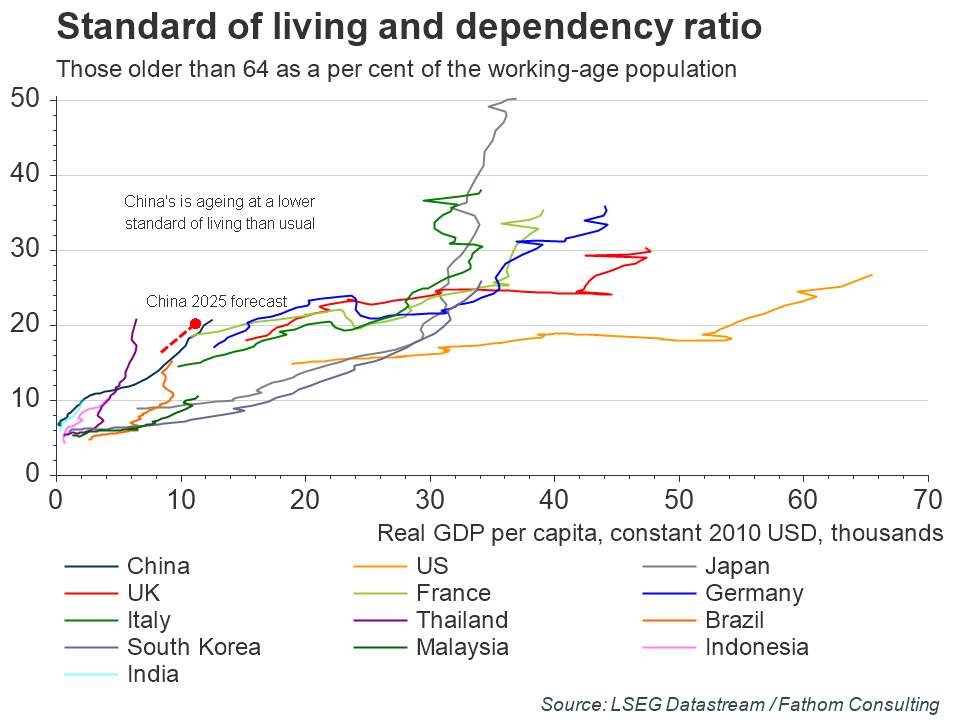 Deteriorating demographics are to be expected in developed economies where the average standard of living is already high. They could prove more problematic in emerging economies like China — but, unfortunately, the same trends are in place there, as the chart below illustrates. If current trends persist, as seems likely, China will get old before it gets rich. And it is not just demographics that present a headwind for China. The evidence suggests that relative lack of political freedom is a long-term constraint on growth. It would be a global first if China were to succeed in breaking the trend towards slower growth without changing its political settlement.