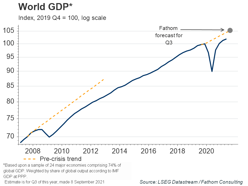 This is a summary of Fathom’s latest Global Economic and Markets Outlook – 2021 Q4. For more on Fathom’s take on the current outlook, and for more topics such as climate economics and the Centrality Tracker (a model of the three hubs of the global economy with their respective spokes), please contact leara.gabay@fathom-consulting.com.