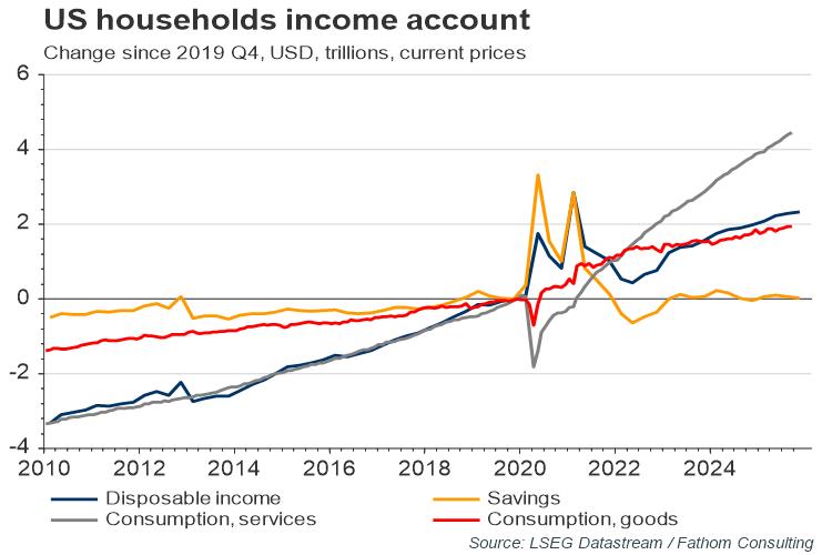 During the pandemic, households across the most advanced economies built up huge excess savings. In the US, incomes rose despite widespread unemployment amid high levels of government support to households. Although consumption expenditure fell drastically, it has now returned to its pre-pandemic level, though it is yet to return to the previous trend. Excess savings in the US amount to as much as 10% of GDP, higher than in other developed economies.