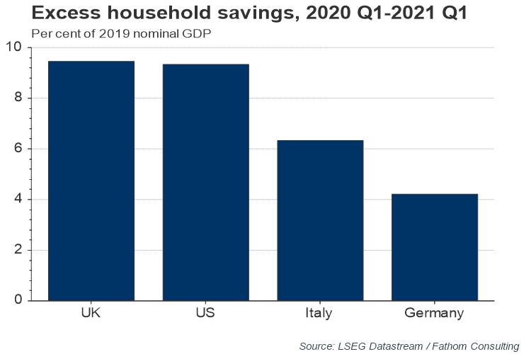 World GDP has surpassed its pre-pandemic level, and Fathom expects output will reach its pre-pandemic trend before the end of the year. Whether this is achieved, will in part be based on how quickly households and non-financial businesses spend savings built up during the pandemic. With elevated inflation, particularly in western advanced economies, a strong recovery through the remainder of the year could push up inflation expectations and put further pressure on central banks to remove some policy accommodation.