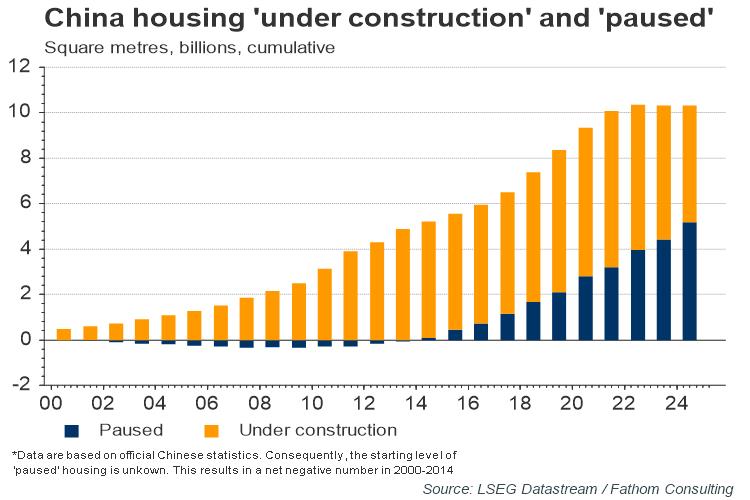 China has been pouring money into residential construction for years: the excess stock of housing is far larger than we previously thought. In addition to the stock of housing ‘under construction’, it seems that there is a rapidly growing stock of housing whose construction has been ‘paused’ and not restarted. Some of this stock will have been demolished, though it is unclear how much. The opacity of the data means that we also do not know and cannot estimate the starting level of the ‘paused’ stock of housing, but we do know how much it has contributed to the overall housing excess in recent years. Consequently, it seems likely that the combined stock of housing under construction and housing paused but not restarted is in the order of 9 billion square metres, enough to house over 200 million people (roughly the population of Brazil) in comfort. Someone, somewhere, thought that was an investment: they will be disappointed or bailed out — the Evergrande crisis so far suggests the latter for homebuyers at least