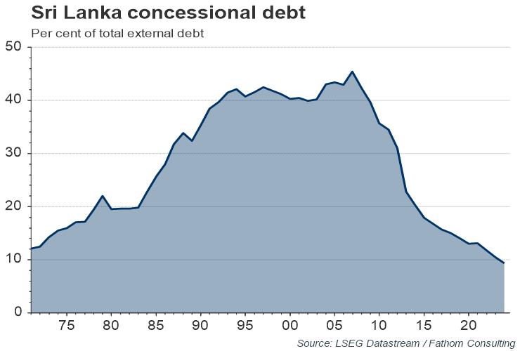 Rather, the key to understanding the country’s fiscal woes appears to be its graduation in the late 1990s from a low-income economy to a middle-income one. Under its previous status, Sri Lanka was able to secure loans from international organisations at favourable rates. However, upon joining the ranks of middle-income economies it was no longer eligible for many of these loans. Therefore, as the country has refinanced its debt, the share of external debt under concessional terms has fallen.