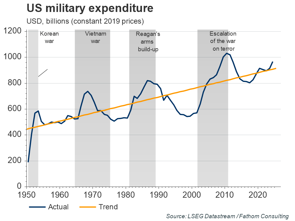 Though real US military expenditure has increased by around 60% since the early 1950s, its share of GDP has declined, from a peak of around 14% in 1953 to less than 4% in 2020. There are clear cycles around that trend, each typically lasting around 15–20 years. The current uptick began under Donald Trump in 2017, has been continued by the present administration, and appears likely to accelerate given the situation in eastern Europe and ongoing tensions with China. Ordinarily, military expenditure is a deadweight loss for the economy, but the modern military is far more tech-dependent, implying that increased expenditure is likely to be highly R&D intensive. While state-led R&D may be less efficient than private sector investment, there could still be sizeable productivity spillovers to the wider economy.