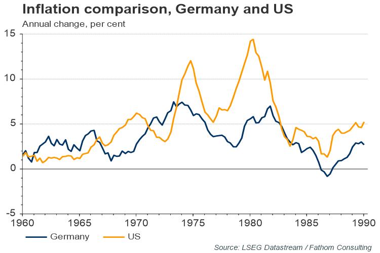 In the 1970s and early 1980s, global inflation surged due to the massive oil price shocks in 1973, triggered by the Arab oil embargo related to the Yom Kippur War, and in 1979, following a drop in production after the Iranian revolution. US inflation rose above 12% in 1974 and peaked at almost 15% in 1980 (chart below), nearly double its current rate. Inflation rose by much less in Germany than most other countries, however, remaining below 8%.