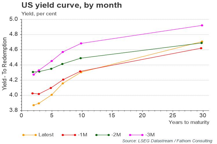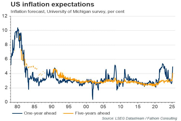 Central bank credibility and low and stable long-term inflation expectations have been anchors for inflation over the past thirty years. Both are threatened by persistently high inflation, but in Fathom’s opinion probably continue to hold fast. When the one-year ahead inflation expectations of US households last moved above 5% for a sustained period, five-year ahead expectations were also above 5%. Currently, five-year ahead inflation expectations of households are around cycle highs at 3% (chart above), but have not kept pace with shorter-term expectations.