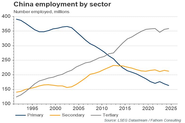 Taking into account the numbers underemployed (not just in construction but across all sectors), the overall amount of slack in the Chinese labour market is not dissimilar now to how it stood in 2010 — there is no shortage of cheap labour in China. However, it does not have markets deep enough to absorb the goods and services its plentiful labour could in principle supply.