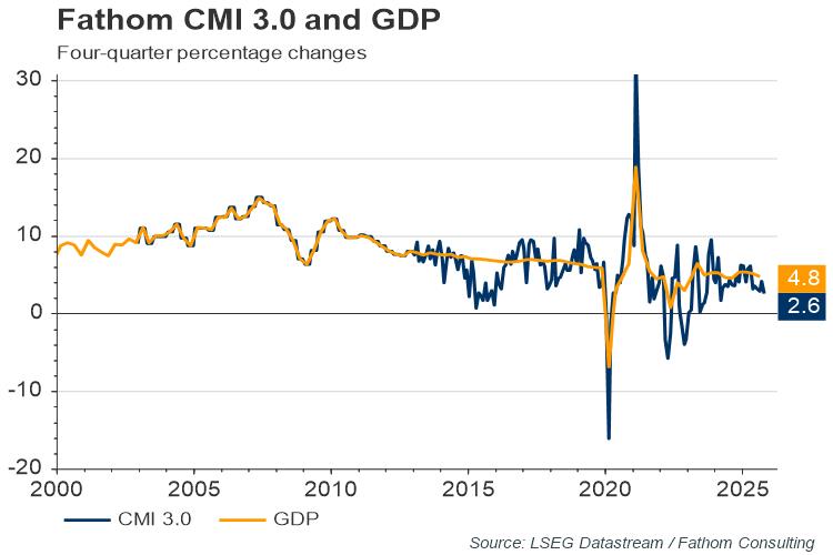 In Fathom’s view, this is due to an additional pool of labour that is potentially available for productive employment, should the demand for such productive labour exist. These are the underemployed. Fathom has long maintained that official Chinese GDP data are overstated, and that in truth GDP growth was substantially slower than the official data suggest in the period between 2013 and 2017. We maintain our own alternative measure, called the China Momentum Indicator (CMI). Its growth compared to that of official GDP is shown in the chart below.