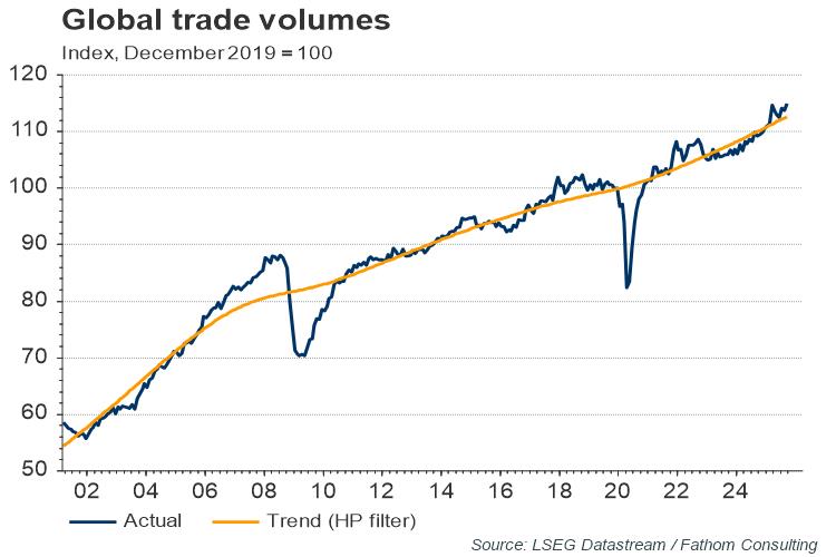 Global trade is currently above its trend, but it may soften a little this year. Trade volumes slumped amid the onset of the pandemic, as countries enacted strict lockdowns, but then recovered sharply, initially boosted by the surge in demand for medical equipment and electrical goods in advanced economies, and then experiencing further tailwinds from recovering global growth. Now however a combination of slower growth and a greater focus on supply chain resilience, both for economic and geopolitical reasons, which is likely to lead to some movement of supply chains closer to home, are set to slow trade somewhat.