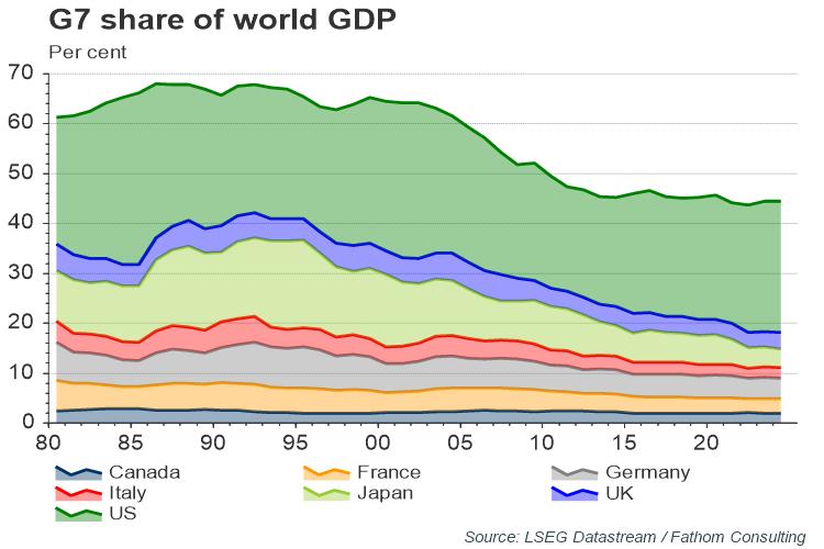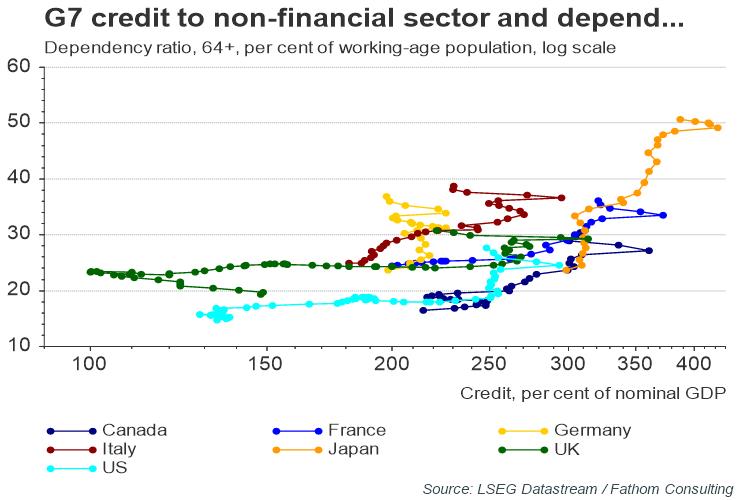 The decline in the G7 economies’ share of world GDP and trade is unlikely to reverse anytime soon. The group faces structural headwinds that are likely to keep growth rates lower than the global average. All have high levels of debt, which Fathom Consulting has previously found works to reduce structural growth rates. An injection of credit can be used to buy additional growth in the short term, but it is not sustainable; and the more an economy relies on credit, the smaller the bang it gets for its buck. High debt levels are made worse by deteriorating demographics, which reduce structural growth rates due to the lower availability of labour. On both fronts, Japan is further down the road than the rest of the G7 and offers an idea of what may lie ahead.