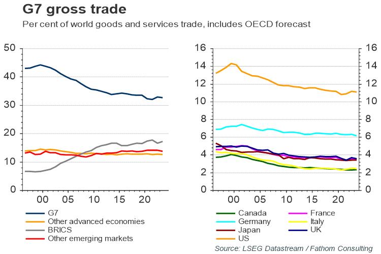 The G7 group of economies has also seen its importance in world trade drop over the past couple of decades. G7 gross trade (goods and services) has declined from 46% of the world total to a figure of 33% in 2021, with the OECD forecasting a rough stabilisation over the next couple of years. The rise of the BRICS, and in particular, China, has been important. The BRICS share of world trade rose from 7% of the world total in 1999 to 18% last year. G7 countries have not all suffered from a ‘China shock’ to trade, with Germany just about holding onto its share of the world market during the years 1999 to 2021.