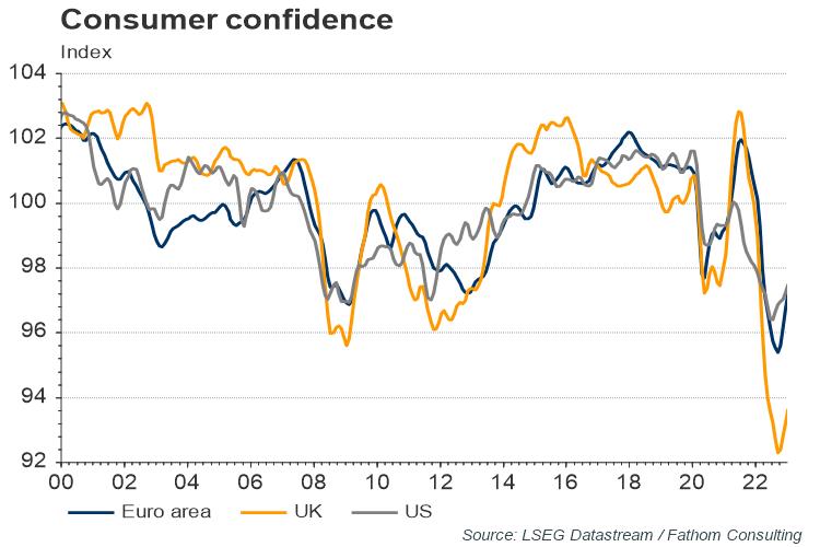 Soaring inflation has hit consumer confidence, suggesting a consumer-led downturn could already be under way in the euro area, UK and US.