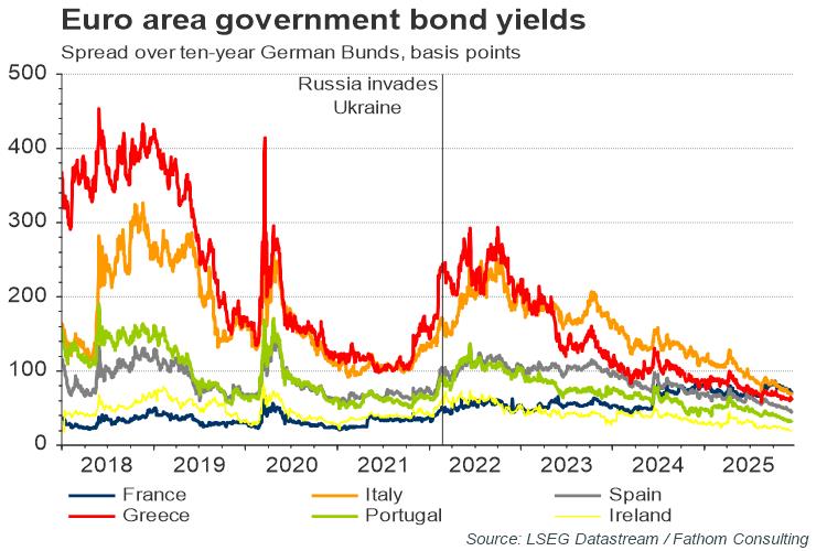 Meanwhile, the ECB is stuck between a rock and a hard place: it can hike rates now to prevent second-round effects on inflation, but at the risk of driving peripheral bond yields higher, thus increasing the risk of a currency bloc breakup; or it can maintain relatively loose policy but at the risk of de-anchored expectations. Fathom judges a recession is overwhelmingly likely in the EU in the coming 12 months.