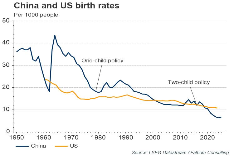 However, projections from the United Nations suggest a very different picture going forward. China’s working-age population appears to have peaked and is expected to roughly halve by the end of the 21st Century. Meanwhile, the US’s working-age population is expected to continue to rise, albeit at a slower rate than before. Collapsing birth rates and a lack of immigration account for China’s particularly poor demographic outlook versus the US. The easing of restrictions around the ‘One-child’ policy has had little impact on Chinese fertility rates, while very high costs of housing, childcare and education are major deterrents to having larger families.