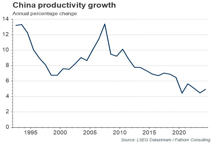 Productivity is the other major driver of long-run growth. In China, labour productivity has grown much faster than in the US in recent years. This is to be expected — economic theory suggests that productivity in poorer countries will converge towards levels in richer ones as ideas and knowhow created at the technological frontier spill over to, and are adopted by, the rest of the world.
