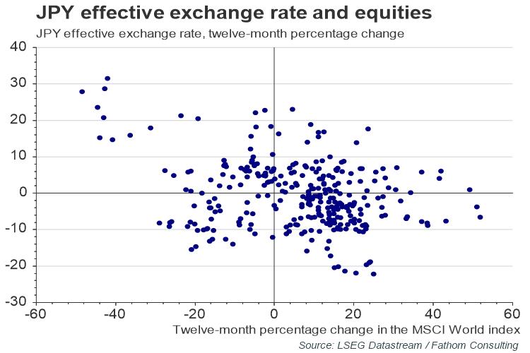 On the face of it, this is an unusual development. In a risk-off environment, when equities are falling, the Japanese yen tends to strengthen. There is, in other words, a negative correlation between equity price changes and the change in the value of the Japanese yen against a broad basket of currencies, as our chart shows. So what is driving the yen down? As ever, the answer lies in not one but a number of factors.