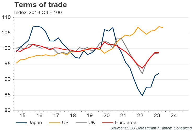 The sharp rise in energy prices has probably been an important driver of recent weakness. Japan is a substantial net importer of energy: in 2021, its net energy imports amounted to 2.91% of GDP. Equivalent figures for the euro area and the UK were 2.13% and 1.10% respectively. The US, by contrast, is a net exporter of energy. Recent movements in energy prices are reflected in the terms of trade for these countries, with Japan’s terms of trade deteriorating substantially since the pandemic, indicating that it has become worse off as a nation.