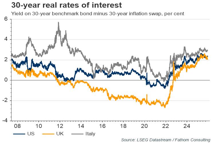 The chart below shows an estimate of the long-run real rate of interest on government debt in different countries measured by the difference between the yield on a 30-year conventional government bond, and the 30-year inflation swap. On this basis, long-term real rates of interest have risen across the board since the beginning of the year, by somewhere between 200 and 300 basis points.[1]