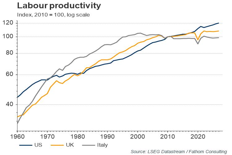 Fathom analysis suggests that, on average over the past month, 30-year real rates of interest on government debt have exceeded plausible estimates of sustainable economic growth over that same period not just in the UK, but also in the US and in Italy.[2] If this is sustained, governments will need to develop a plan for running not just a primary surplus, but a primary surplus that is sufficient to stabilise government debt as a share of GDP. As shown in the chart below, after stripping out the effects of the economic cycle, both the US and the UK have run persistent deficits for the best part of 20 years. Italy has tended to run a primary surplus, but given very high levels of government debt as a share of GDP in that country, and the sizeable gap between r and g, it has not been of sufficient size to ensure stability.