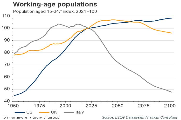 Conceptually a country is able to grow either because each worker is able to produce more, or because it has more workers, or through a combination of the two. From that perspective, the trend rate of growth is the sum of two parts: labour productivity growth and growth in the working-age population. As shown in the two charts below, not only has labour productivity growth slowed across the board since the Global Financial Crisis, in most major economies the size of the working-age population is projected to be either broadly flat, or to fall over the next 30 years. In the case of the UK, Fathom estimates that the trend rate of growth over the next 30 years is likely to be as low as 0.7%.\