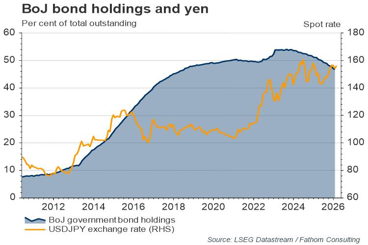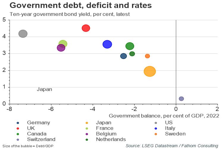 At 263% of GDP, Japan has by far the largest sovereign debt burden in the world. Half of the government bonds in that debt mountain belong to the Bank of Japan. What would happen if the market regained control of Japanese yields? Fathom expects borrowing costs would rise, and potentially by enough to exceed growth, meaning that primary surpluses would be needed to stabilise the debt level. That’s something we have not seen for many a moon in Japan.
