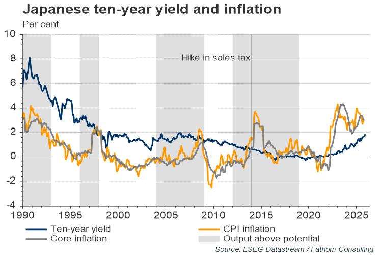 Forward-looking, market-based measures of Japanese ten-year real rates are already only slightly negative (-0.6%), and that is with the BoJ surpressing upward moves in nominal rates. With Japanese trend growth running at between 0.5 and 1%, a rise in in real yields of more than 1 percentage point could thus create adverse debt dynamics. To put that possibility in context, UK and German ten-year real yields have risen by 2.5 and 1.4 percentage points so far this year. This scenario would put Japanese debt on an explosive path, without fiscal consolidation. Given that Japan has not run a primary surplus since the early 1990s, that should give pause for thought. Events in the UK this year should act as a wake-up call to others: being an advanced-economy currency issuer does not prohibit the possibility of a fiscal crisis if market sentiment sours.