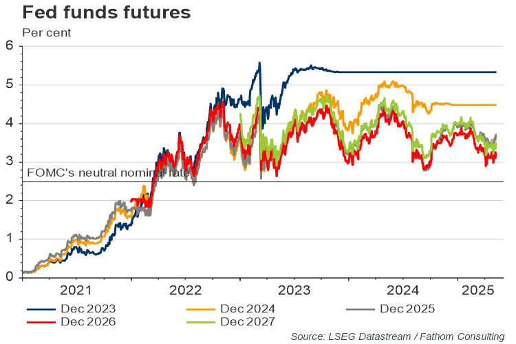 The re-pricing of near-term US interest rate expectations that occurred in the week following the collapse of Silicon Valley Bank (SVB) on 10 March was as dramatic as any since the stock market crash of 1987. Can this be justified? Let us assume investors currently have in mind two scenarios. Either we are on the verge of a banking crisis similar to the Global Financial Crisis (GFC) of 2008-09, and the Federal Reserve is set to cut aggressively, taking rates rapidly back down to the zero lower bound; or we are not, and the US economy evolves more or less as expected prior to the collapse of SVB. In this simple, bi-polar world, the 150 basis-point fall in the year-end federal funds rate implied by futures prices, from around 5.5% to around 4.0%, would suggest that investors attach around a 25% weight to a re-run of the GFC. For Fathom Consulting, that implied probability is too high. What if concerns about a re-run of the GFC fade over the next few weeks, and market pricing for US interest rates returns to the levels seen in early March? Then we are in a world where the US policy rate is expected to be more than 150 basis points above the Fed’s estimate of neutral for at least the next four years, even though many economists, and many investors, see a real prospect of recession. From our perspective, rates implied by federal funds futures are a little too low in the near term, but substantially too high further out.
