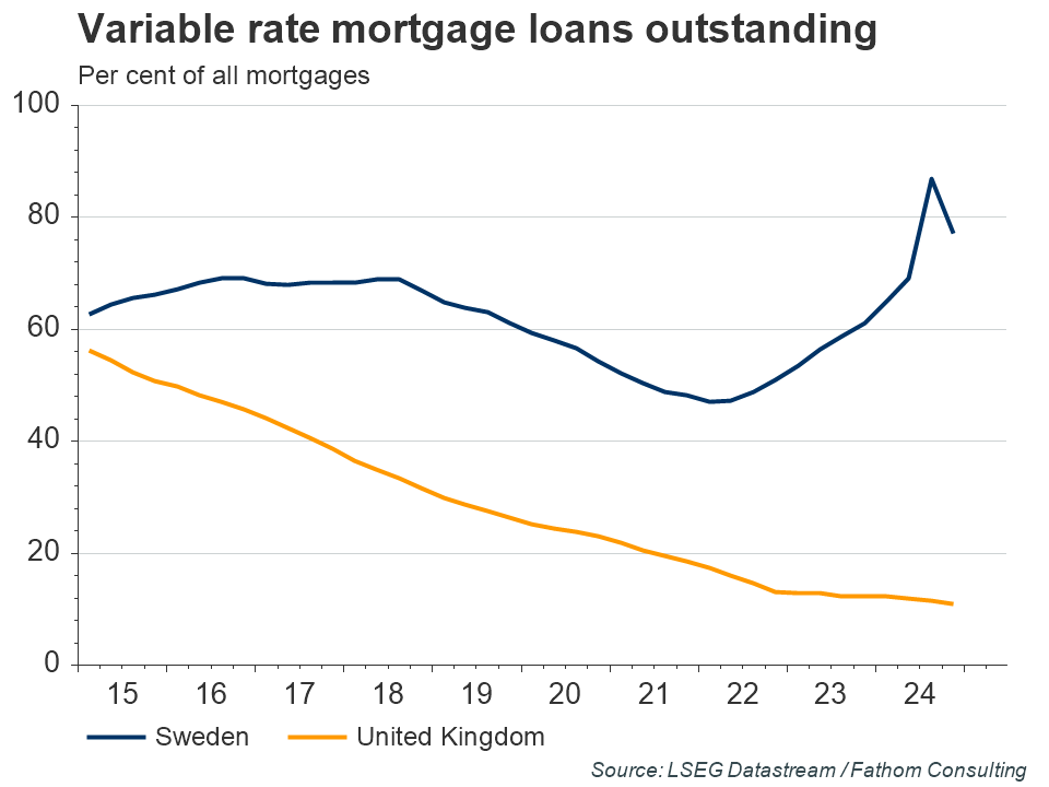 This trend has been broken by the sudden tightening in monetary policy seen in the past year, which has reduced affordability for new buyers and increased borrowing costs for those with short fixed-interest-rate periods on existing mortgages. Sweden is particularly sensitive to changes in interest rates as it has an unusually large share of variable-rate mortgage lending, with 51% of outstanding borrowing for house purchases having an interest rate linked to the policy rate. This market structure has speeded up and amplified the transmission mechanism of policy-rate changes to house prices.