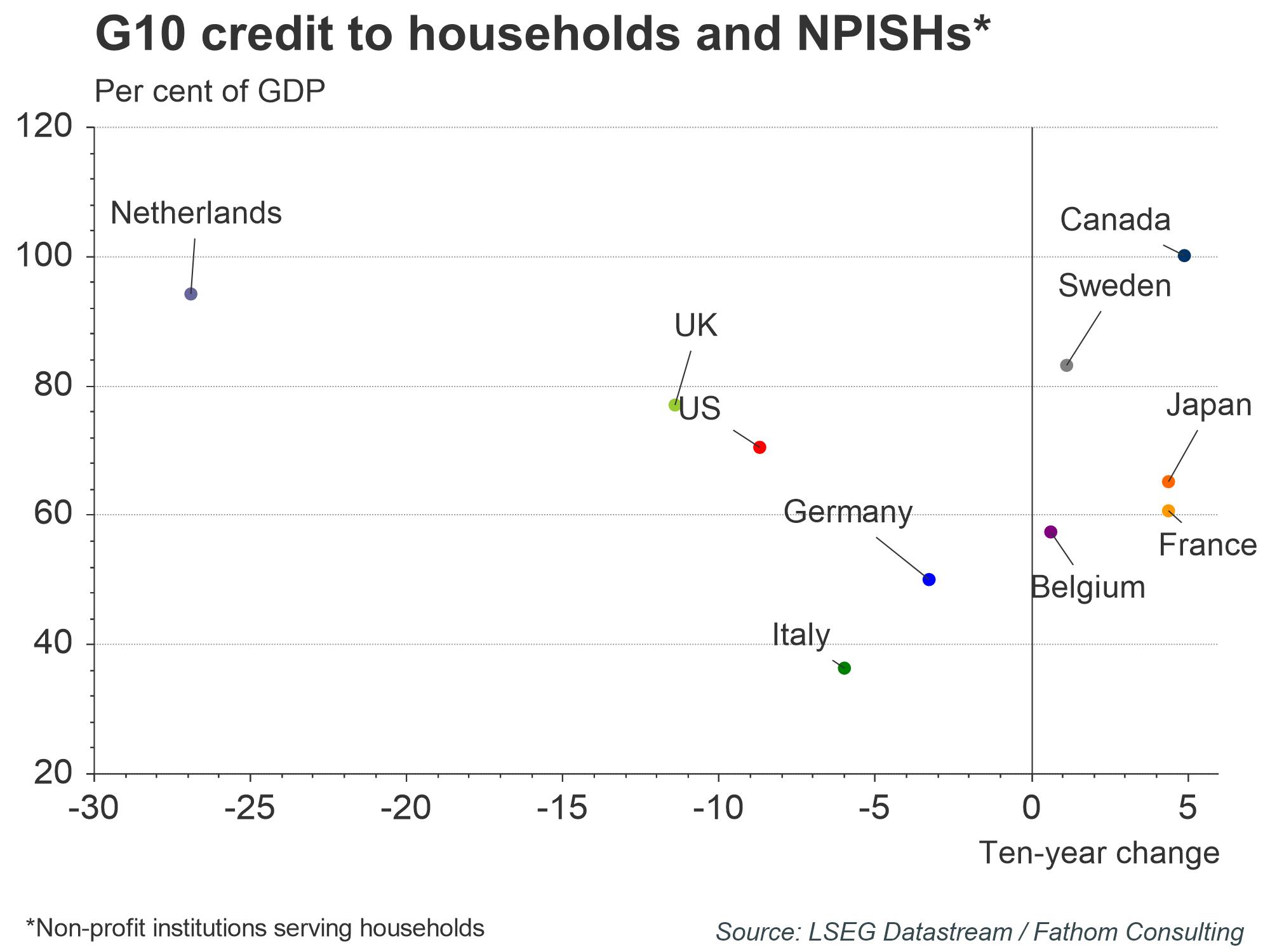 Fathom warned about the risks to the Swedish real-estate sector back in March. Our Financial Vulnerability Indicator (FVI) tool flagged the vulnerability of the Swedish banking sector to falling house prices. According to the FVI, the G10 banking systems most at risk from falling prices are Sweden, Canada and France. All three of those countries have experienced strong private sector credit growth in the past decade, which research has shown tends to make the aftermath of housing bubbles worse.