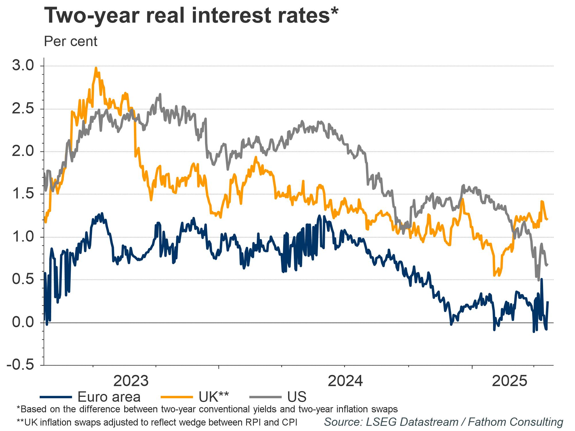 The UK economy is now expected to operate with positive real rates over at least the next two years. If we make an adjustment for the upward bias in UK RPI compared with CPI measures in the UK and elsewhere, then the expected two-year real rate, which had been negative — often substantially so — throughout last year as inflation moved into double digits, may now be as high as 1.9%. That appears close to investors beliefs about the neutral real rate of interest, to the extent that is reflected in the real forward rate curve, with real forward rates averaging around 2.0% beyond ten years, after making an adjustment for the upward bias in RPI described above. On that basis, it is unclear to us that either current or expected UK policy is tight enough. This is an issue that Fathom will revisit in our upcoming Global Outlook, Summer 2023 — highlights will be available to Refinitiv subscribers in Chartbook.