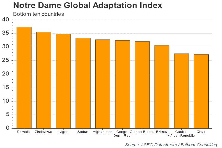 Self-interest and realpolitik aside, it is important to focus on what the scientists think and the views of those people living in regions which are more vulnerable to the effects of climate change and less able to adapt. African countries make up nine out of the top ten countries most exposed to the worst effects of climate change, according to the Notre Dame Global Adaptation Index, one of a series of useful energy- and climate-related sovereign datasets now available on Datastream (lower scores indicate greater vulnerability). The global North will need to explain to these countries what they are doing to keep a temperature increase of 1.5C alive – hard cash will help, to pay for loss and damage, adaptation and transition support.
