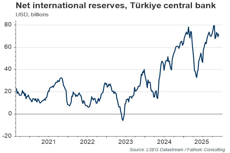 Türkiye’s central bank seemed to use its resources to prop up the lira ahead of the election, with its net international reserves position dropping from $27.5 billion to $6.8 billion between the start of 2023 and the eve of first round voting. This position has declined even further since, dropping below zero for the first time since records began in 2020. Without central bank reserves to defend the currency, the lira has been easy prey for short-selling speculators. The result has been a large depreciation.